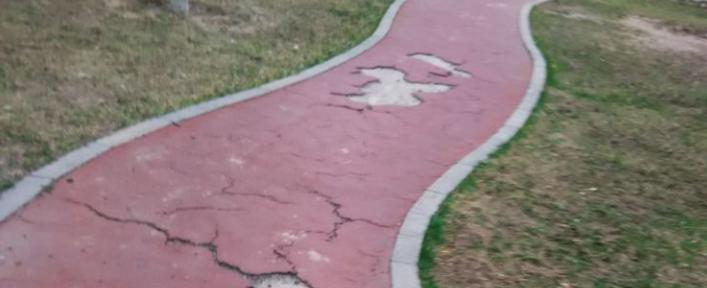 在鄭州某小區塑膠跑道使用至今,在面層、色澤、外觀上都出現了不同程度的損壞,出現了部分區域脫層破損的情況,一是小區塑膠跑道已經達到正常的使用壽命,二是社區環境中,不少小區居民在使用過程中,使用不當造成的外部破壞。